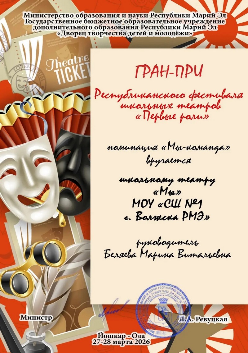 Школьный театр «МЫ» МОУ СШ № 1 города Волжска завоевал гран‑при республиканского фестиваля школьных театров «Первые Роли», который прошёл в Йошкар‑Оле. Юные актёры представили постановку «Чайка по имени» — сценическую интерпретацию повести‑притчи Ричарда Баха «Чайка по имени Джонатан Ливингстон». Спектакль впечатлил жюри и зрителей глубиной раскрытия темы, слаженной игрой коллектива и художественной выразительностью. Особую гордость вызывает успех ученика Хайруллина А.: он одержал победу в номинации «Лучшая роль». Его актёрское мастерство, эмоциональная вовлечённость и точное попадание в образ не оставили судей равнодушными и стали одним из ярких моментов фестиваля. Этот триумф — результат кропотливой работы всего коллектива: актёров, режиссёра и тех, кто помогал в подготовке постановки. Участники не только продемонстрировали талант, но и получили бесценный опыт выступления на республиканском уровне. Поздравляем театр «МЫ» и его руководителя Беляеву Марину Витальевну! Желаем коллективу новых творческих успехов, вдохновляющих ролей и громких аплодисментов на будущих фестивалях.